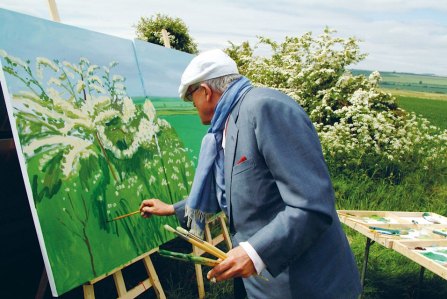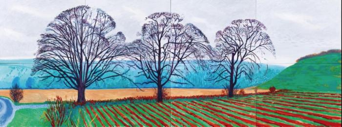 These imagined scenes are in stark contrast to the majority of the paintings in the exhibition, which are recent works Hockney has produced since returning to his family home in Bridlington, East Yorkshire, on the eastern corner of the Yorkshire Wolds. In these multiple canvases or iPad prints, painted from memory or en plein air, Hockney revels in the landscape, capturing the spirit of hurtling over the hills, catching the morning light in the woods, meditating on trees in the different seasons.