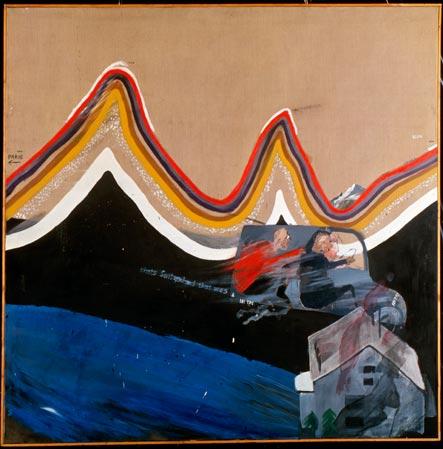 In the same room are two other paintings with distinctive geological motifs: Flight into Italy – Swiss Landscape (1962) and Rocky Mountains with Tired Indians (1965). In both, the mountains are symbolized by a distinctive Aquafresh stripe of geological stratigraphy, influenced, Hockney states, ‘by the 1962 paintings of Harold and Bernard Cohen’[4].