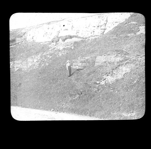 LDGSL/1088/AC/GB/66Black and white photograph of a geological feature in Frocester, by Ananda Kentish Coomaraswamy, [1890s-1900s].    The woman who is included in the scene for scale purposes could be Ethel Partridge, later Ethel Mairet, who became Coomaraswamy’s first wife in 1902.