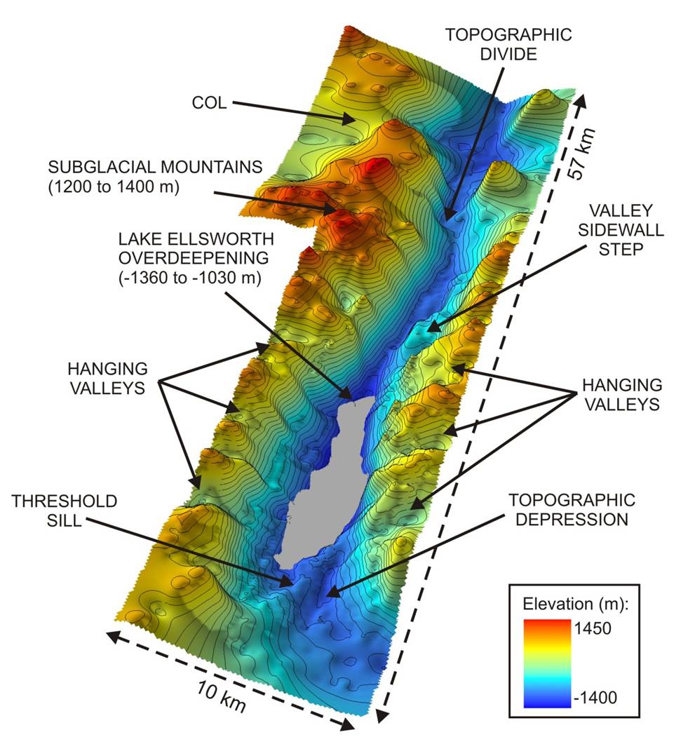 Lake Ellsworth in West Antarctica is similar in size and topographic setting to Windermere in the Lake District; it is 14 km long, 2-3 km wide, 150 m deep, and is contained within a steep glacially-carved valley. The only main difference is that Lake Ellsworth lies beneath 3 km of ice.