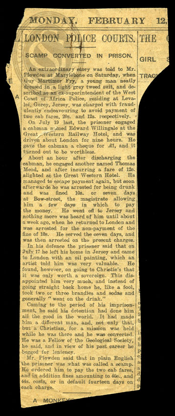 The cutting – wonderfully entitled ‘LONDON POLICE COURTS. Scamp converted in Prison’ – details the case against Fry, who was accused of not paying for two cab journeys he took one after the other on the same day.