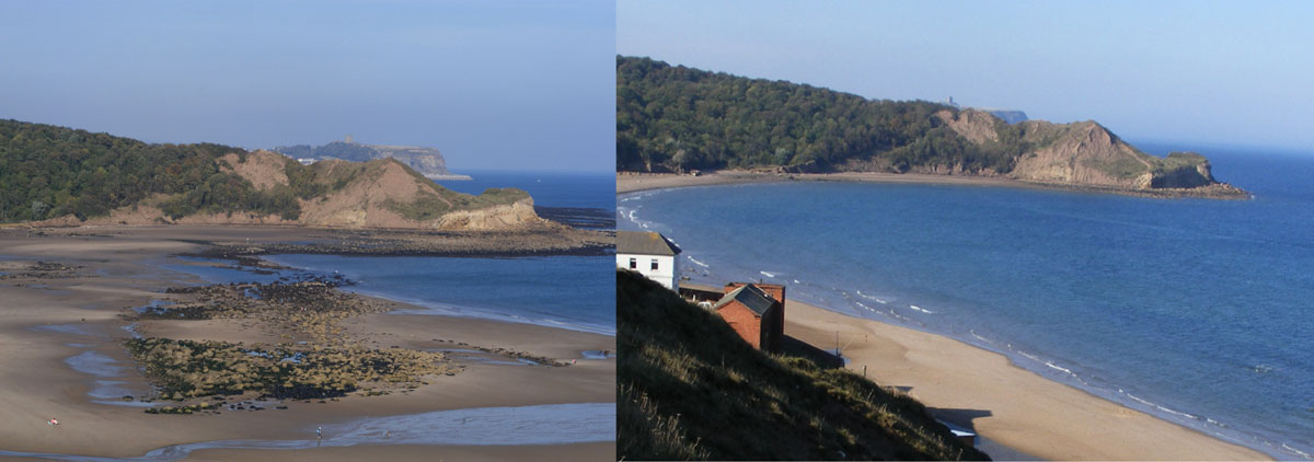 Tide out and in – exposing Scarborough Formation rocks. Scarborough is in the distance – the Cayton Bay Fault cuts through behind the castle. On the right, you can just see the waterworks – the fault “starts” from behind there.