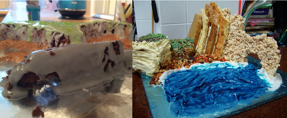 It’s all getting a bit serious now. Ring of fire was a tricky challenge – we had some volcanoes, some globes, some edible maps, and some subducting sponge layers. You all get 60 points for not copping out and just icing ‘Ring of fire’ onto a sponge.