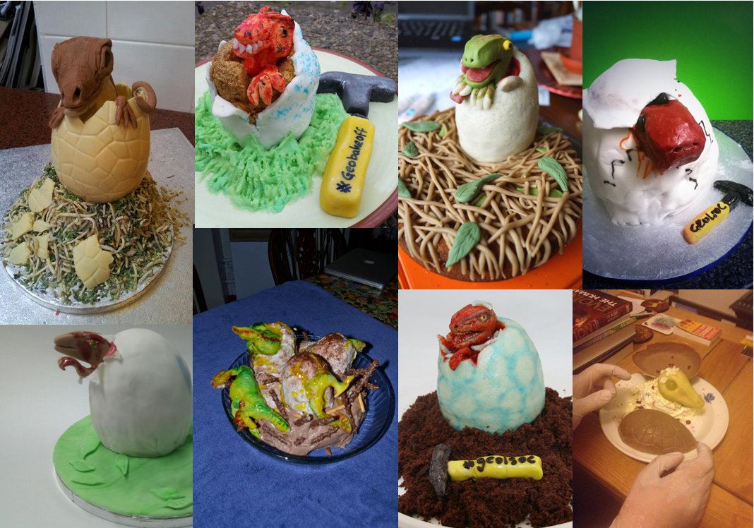 Hatching velocipraptor bakers, we salute you all, for your geobaking prowess, your vision, and for the fact that there is now a file on the Geological Society’s servers entitled ‘hatching velociraptor cake montage.’ Cue theme tune: