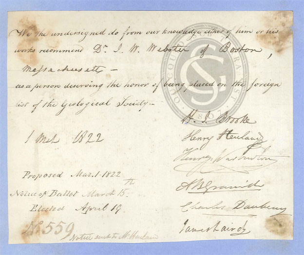 John White Webster’s admission certificate nominating him as a Foreign Member of the Geological Society, March-April 1822 (GSL/F/1/2)