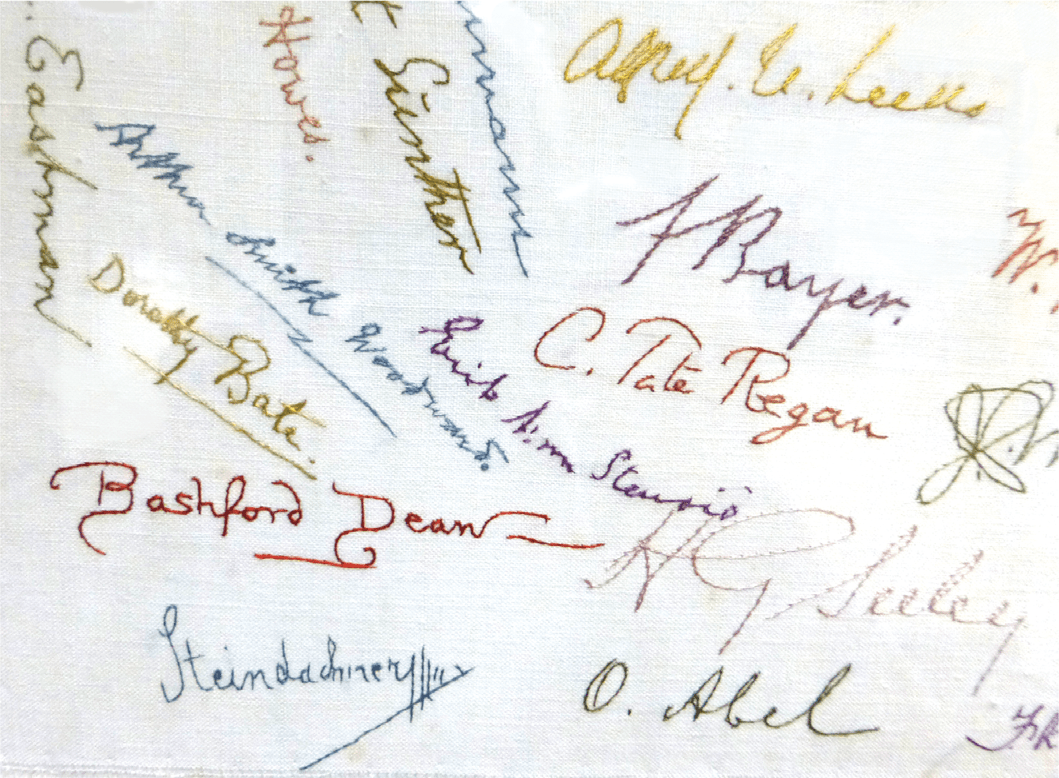 tablecloth 2 Published March 11, 2016 at 1059 × 778 in Lady Woodward’s tablecloth ← Previous Next → Lower left corner of the tablecloth that includes signature of Arthur Smith Woodward (blue). Image from ‘Lady Smith Woodward’s Tablecloth’, SP 430, 89-111