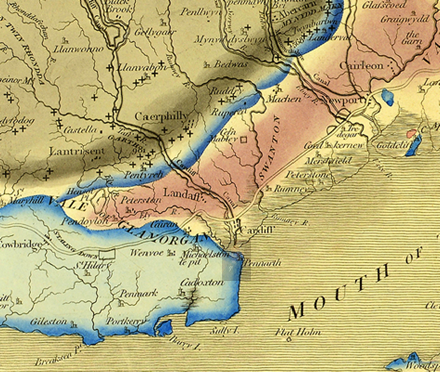 If you’ve managed to spot William Smith hiding in the map, you’ll see he’s near the coast at Lavernock Beach in Penarth. This is for a very special reason – it’s the site of a famous dinosaur skeleton find by local residents Nick and Rob Hanigan! The brothers went beachcombing for fossils after the storms of spring 2014 when, much to their surprise, they found the fossilised skull and bones of a dinosaur! The skeleton was identified as being distantly related to Tyrannosaurus rex, part of the theropod family, albeit a bit smaller. This dinosaur stood on two legs and was a small, agile animal around 2.2ft tall and 6.5ft long including a long tail for balance. Scientists recovered about 40% of the dinosaur’s skeleton, which was found embedded in sedimentary rocks at the base of a collapsed cliff. This specimen was subsequently named ‘Dracoraptor hanigani’; Draco meaning Dragon (the symbol of Wales) and hanigani honouring Nick and Rob Hanigan who discovered the amazing fossil. Nick and Rob subsequently donated the specimen to the National Museum of Wales where you can now see it on display.
