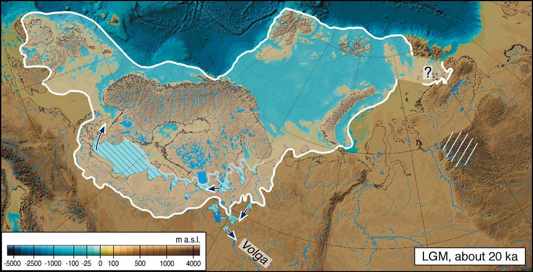 A map showing the late glacial maximum in Eurasia ~20,000 years ago. You can see that glaciers reached South Wales, Ireland and central England at their greatest extent. Image courtesy of Jan Mangerud, Wikimedia Commons.