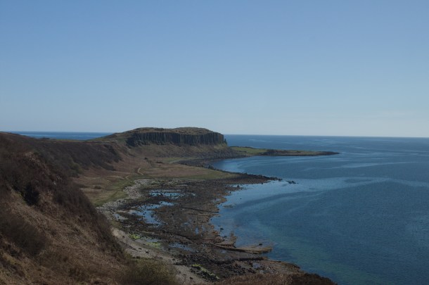 At the far South of the island at low tide you can marvel at the Kildonnan Tertiary dyke swarm. Anyone who is lucky enough to venture to Thingvellir in Iceland and see sea floor spreading at first hand must marvel at the sheer number of dykes emplaced in a kilometre of crust. Applying a bit of Hutton’s wisdom, Iceland’s present is Arran’s past. In the far distance you can also see the sills which make up Pladda, Holy Island and the volcanic plug that is Ailsa Craig.