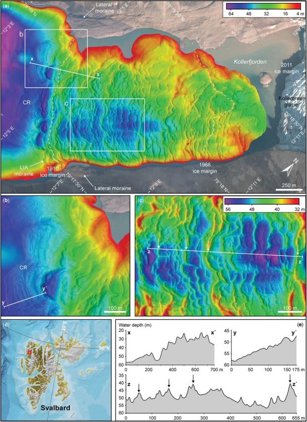 Multibeam imagery of Kollerfjorden, NW Spitsbergen. Burton et al., ‘Little Ice Age terminal and retreat moraines in Kollerfjorden, NW Spitsbergen’, Atlas of Submarine Glacial Landforms pp. 71-72