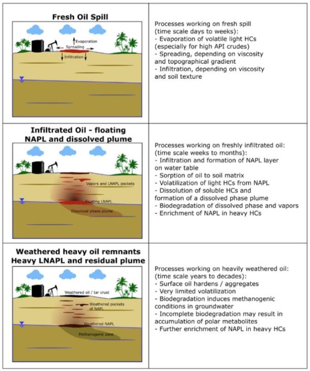 A conceptual model of heavy hydrocarbon fate and transport in the environment. Heavy hydrocarbons are typically released together with lighter hydrocarbon fractions that are found in most crude oils. This modifies the physical and chemical properties that significantly affect the transport on soils and in the subsurface. Releases of viscous refined bitumen or extremely heavy crude oils (APIo < 12) are unlikely to travel any significant distance in the soil or subsurface. From Brown et al., ‘Heavy hydrocarbon fate and transport in the environment’, QJEGH Vol 50, issue 3
