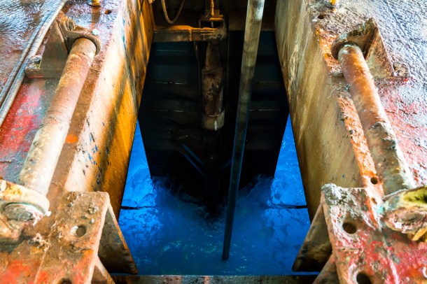 The moonpool – the hole in the middle of the boat that the drill pipe is lowered down to the seabed through. Image c. Vivien Cumming