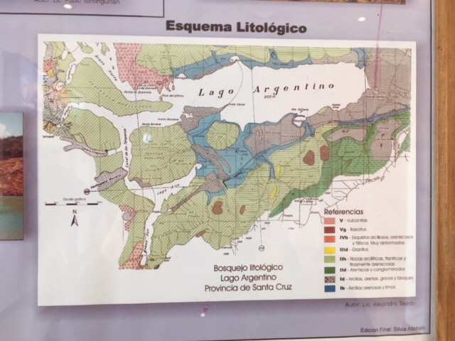 Geological map of the area around Lago Argentina. The rocks in the area of the glacier (to the west of the map) are all fine sandstones and sediments.