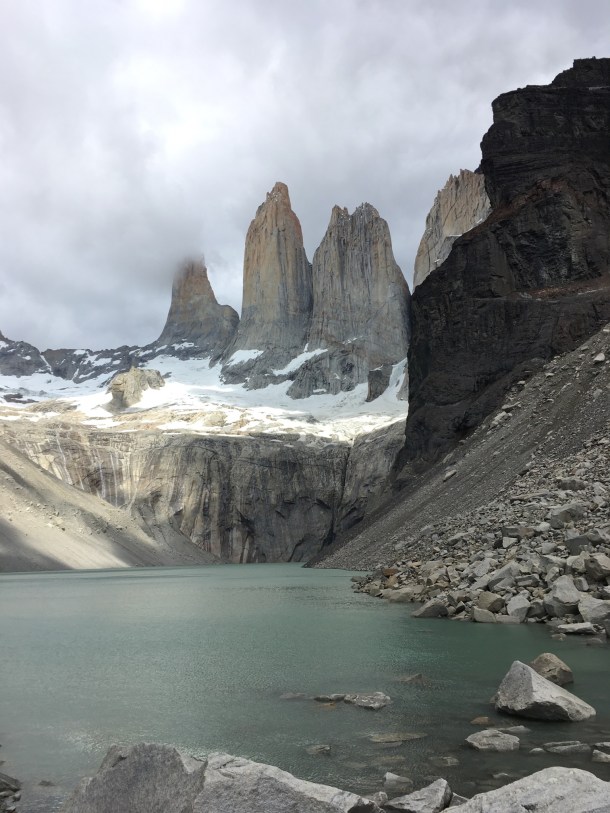 back up. This time we were rewarded with a beautiful, almost completely clear view of the granite spires looming over the milky blue glacial lagoon. The weather is notoriously bad/changeable at the park and we basically experienced all the weathers (bar snow) in one day. Sometimes it was raining, sunny and 80km/hr winds all at the same time!