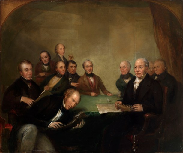The British Association at Newcastle by Thomas Henry Gregg (?1838). Charles Lyell sits at the centre of the table. GSL/POR/18