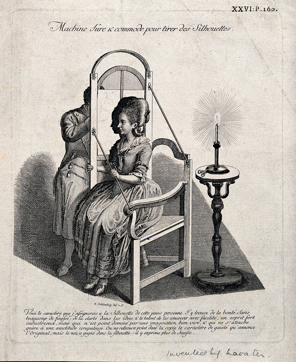 Johan Caspar Lavater’s ‘Machine for drawing silhouettes’, etching by J R Schellenberg (1783), source: Wellcome Trust.