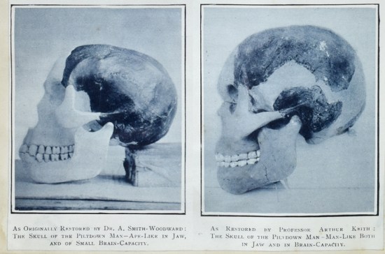 The painting ‘Discussion on the Piltdown Skull’ by John Cooke (1915) depicts a group of scientists analysing the second reconstruction of the skull of Piltdown Man at a meeting at the Royal College of Surgeons on 11 August 1913. Piltdown Man was one of the most notorious scientific hoaxes of the early 20th century, when Charles Dawson (standing, under the image of Darwin) claimed to have recovered the remains of a human skull from a reputedly ancient gravel bed located at Barkham Manor, near Piltdown in Sussex. The skull’s features and suggested age, based on the fossils found alongside, meant that it was interpreted as the long predicted ‘missing link’ between apes and modern humans. The fragments were first shown at the Geological Society on 18 December 1912, but weren’t exposed as a fraud until 1953 when the then new dating techniques determined that the cranium was only 500 years old and the jaw came from an orangutan. It has been claimed that the Piltdown fraud set back research on the evolution of man by decades, but how was this amateur antiquarian (with techniques involving the liberal use Van Dyke brown paint and dental cement) able to pull the wool over the eyes of most of the scientific community at the time?