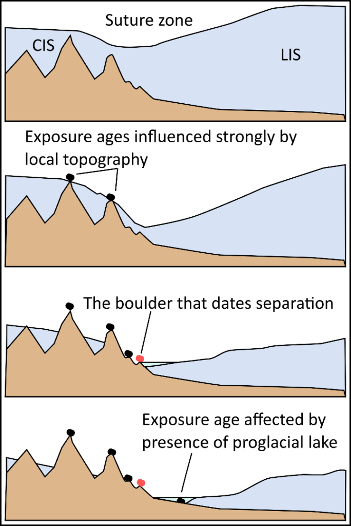 Whilst the timing remains poorly understood, the geographical location of the separation is well known. Our work used cosmogenic isotope exposure age dating to determine points of separation along the suture line between ice sheets using samples from glacial erratic boulders, in what is today Western Canada. From this work, we were able to infer whether the timing of the suture was coincidental with the Meltwater Pulse 1a.