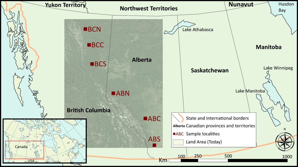 The separation of the Laurentide and Cordilleran icesheets during deglaciation with approximate age constraints (radiocarbon dates). The sampling sites were taken from a transect along the suture line in the provinces of British Columbia and Alberta. Based on figures from Dyke, 2004.