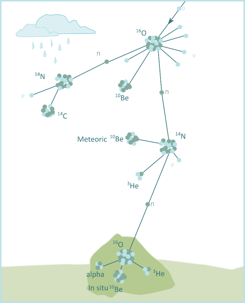 Cosmic rays enter the Earth’s atmosphere from space. They interact with atoms in the atmosphere and in rocks on the Earth’s surface and cause spallation (the break-up of atomic nuclei into new elements). One rare isotope that is made in this way is beryllium-10, which originates from the spallation of oxygen or nitrogen. The longer a surface is exposed to the atmosphere, the more 10Be is made from these reactions.
