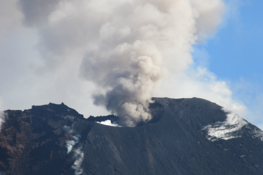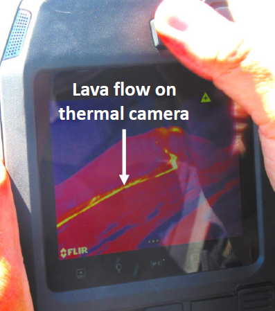 During the day, the orange colour of the lava was hard to see (Picture 1) so we used a thermal camera (Picture 2) to determine how far the molten part of the lava flow had travelled into the valley below the crater. We also observed many small explosions (Picture 3), throwing out ash and blocks of molten lava, from the top of the south-east crater. Once the sun set, the glowing orange colour of the lava became visible, treating us to a spectacular view (Picture 4)! The eruption continued for around a month, with the lava flow eventually extending down to around 2000 m elevation. The lava flow posed no threat to civilization and instead became a popular tourist attraction whilst it was active.