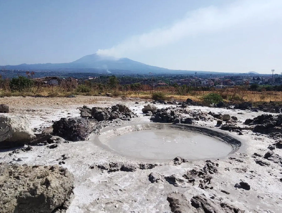 A more unusual field day was the visit to the “Salinelle” or “mud volcanoes” near the town of Paterno on the south-west flank of Etna. The “mud volcanoes” are a series of vents that erupt muddy fluids, which are composed of a mixture of water and gases derived from underlying sedimentary rocks and carbon dioxide which has escaped from magmas deep below Etna. Picture 5 shows a bubbling mud volcano vent with Etna in the background. The mud volcanoes are a surprisingly useful indicator of upcoming volcanic eruptions! In the weeks to months before volcanic activity begins, the temperature of the muddy fluids increases and sometimes large eruptions of mud occur. These events are likely triggered by large volumes of gas which escape from the rising magmas that go on to erupt at Etna, explaining why the mud eruptions occur shortly before volcanic eruptions.